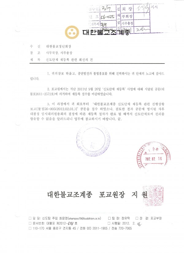 3. 이 과정에서 귀 회로부터 "대한불교조계종 신도단체 재등록 관련 진행상황[불청56-005(2012.02.01.)]" 공문을 접수 하였으나 검토한 결과 공문에 명시된 차후 대불청 임시대의원총회의 결정에 따른 재등록 절차가 완료 될 때까지 신도단체로써 권리를 함유할 수 없음을 알려드리니 업무에 참조하시기 바랍니다. 끝.