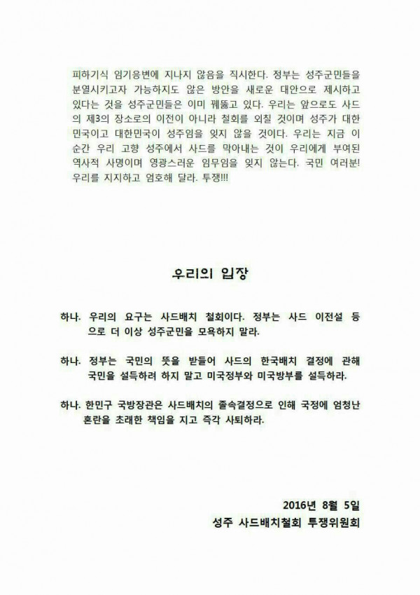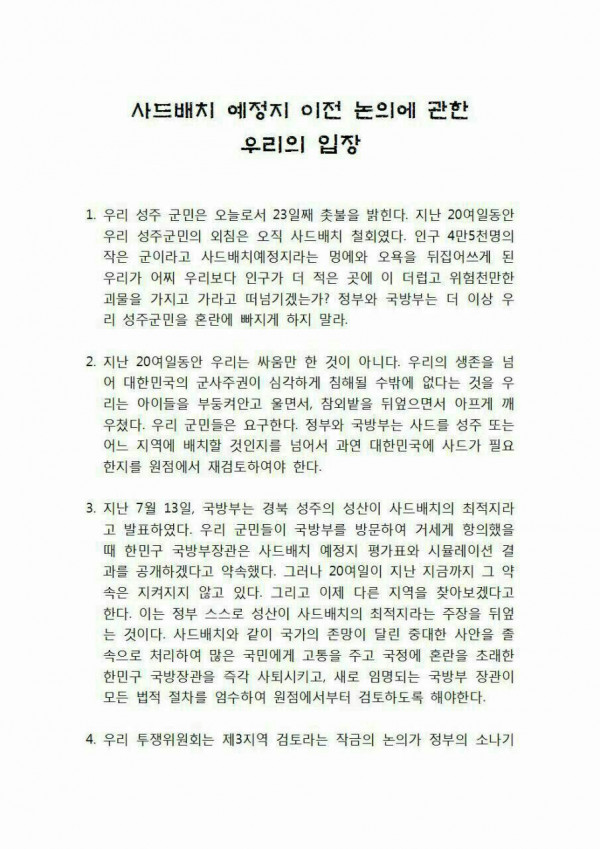 사드배치 예정지 이전 논의에 관한 성주 군민 입장