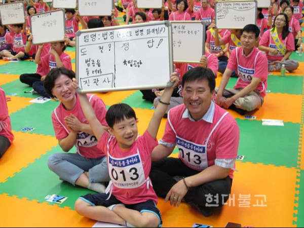본 퀴즈시작전 몸풀기용으로 진행된 퀴즈에서는 ‘총무원장 자승스님은 연예인 누구를 닮았을까요?’라는 질문에 장동건, 이승기, 김태희, 없다 등 다양한 답이 나오면서 현장 분위기를 한껏 무르익었다. 하지만 초반부터 참가자들이 대거 탈락하자 댄스경연으로 패자부활전을 치르며 본 게임이 펼쳐졌다. 각 사찰별 열띤 응원전도 눈길을 끌었다. 진관사 은석초등학교 국제선센터 봉은사 보리수어린회 등 다양한 플랑카드가 벽면을 장식하며 대회에 참가한 어린이들을 격려했다.