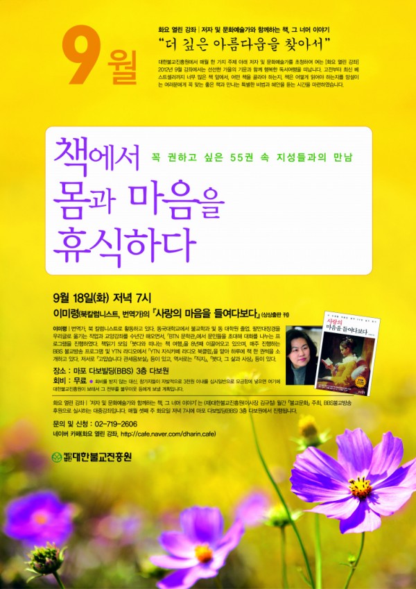 대한불교진흥원에서 매월 한 가지 주제 아래 저자 및 문화예술가를 초청하여 여는 [화요 열린 강좌] 2012년 9월 강좌에서는 선선한 가을의 기운과 함께 행복한 독서여행을 떠납니다. 고전부터 최신 베스트셀러까지 너무 많은 책 앞에서, 어떤 책을 골라야 하는지, 책은 어떻게 읽어야 하는지를 망설이는 여러분에게 꼭 맞는 좋은 책과 만나는 특별한 비법과 혜안을 듣는 시간을 마련하였습니다.