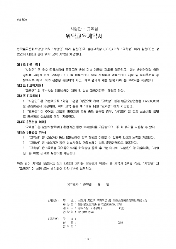- 교육생 참가자 이력서, 위탁교육계약서, 신분증 사본, 통장사본(각 1부)