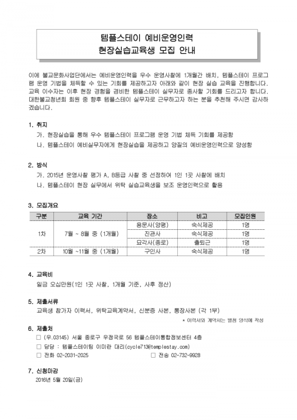 템플스테이 예비운영인력 현장실습교육생 모집 안내