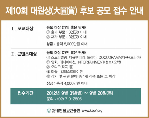 재단법인 대한불교진흥원에서는 불교를 현대적으로 재조명하고, 21세기 현대사회에 적합한 새로운 포교활동에 기여한 출가, 재가자(개인/단체)를 대상으로 한 포교대상과 콘텐츠대상으로 구분하여 시상하는 제10회 대원상 후보 공모 접수를 시작합니다.