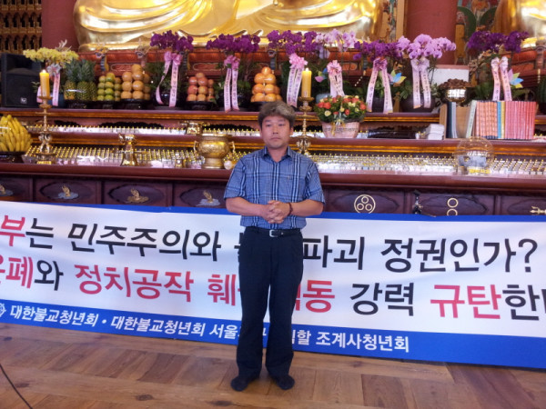 지난 6월23일 토요일 오후4시 대한불교청년회가 주최하고 대한불교청년회 직할 조계사청년회, 서울지구가 주관한, 민주주의 파괴 불교계 불법사찰 이명부정부 규탄 정치공작 중단 청년불자 시국법회가 조계사 대웅전에서 있었습니다.