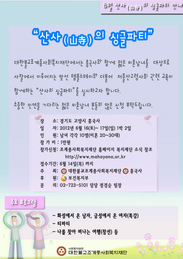 젊은 싱글 남녀의 건전한 결혼관을 위한 "산사의 싱글파티" 안내