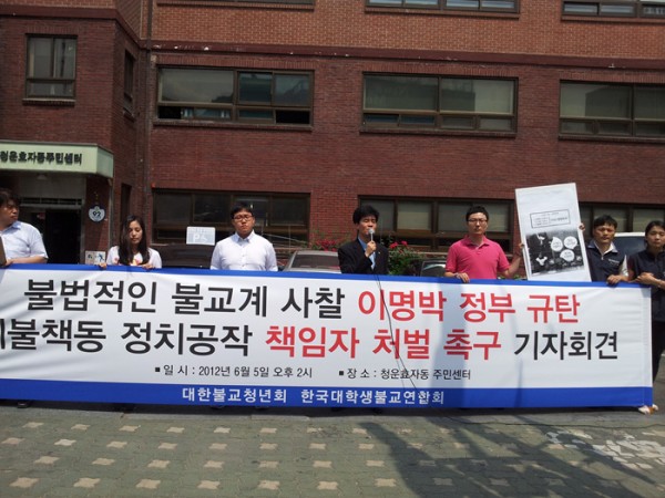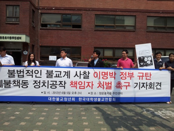 이명박 정부가 조계종 전 총무원장 지관 스님 등 불교계 주요 인사를 불법 사찰을 했다는 정황이 포착돼 검찰이 수사에 나선 가운데 대한불교청년회와 한국불교대학생연합회 등 청년불자들이 긴급기자회견을 열어 이명박 정부를 규탄하고 나섰다.