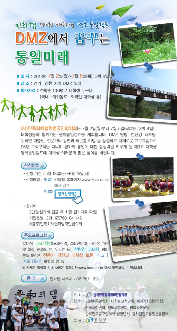 대한불교청년회는 민화협 주최로 타 통일단체들과 함께 아래와 같은 대학생 평화통일 캠프를 진행합니다. 대학생 여러분의 많은 관심과 참가를 부탁 드립니다. ^^