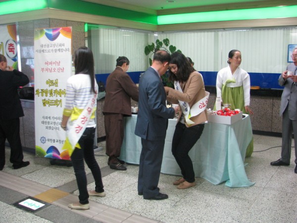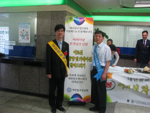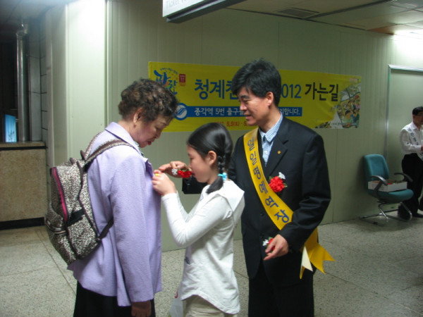 작년부터 이어져온 이 행사는 대불청 정우식 중앙회장님이 일일 종각역장으로 활동하시며 지하철 이용승객중에서도 어르신들에게 카네이션을 달아드리며, 어버이 은혜에 감사하는 마음을 갖자는 취지로 전개되었습니다.