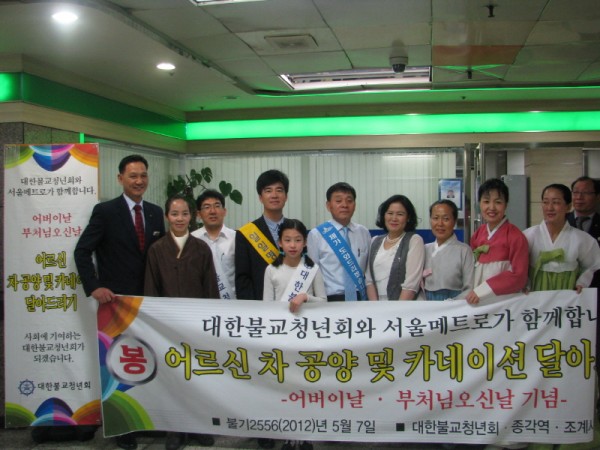 -내 용- -제목:대한불교청년회,부처님오시날·어버이날 맞이 ‘어르신 차공양 및 카네이션 달아드리기’ -장소:종각역 -일시:불기2556(2012)년 5월7일(월) 10시부터~11시까지 |