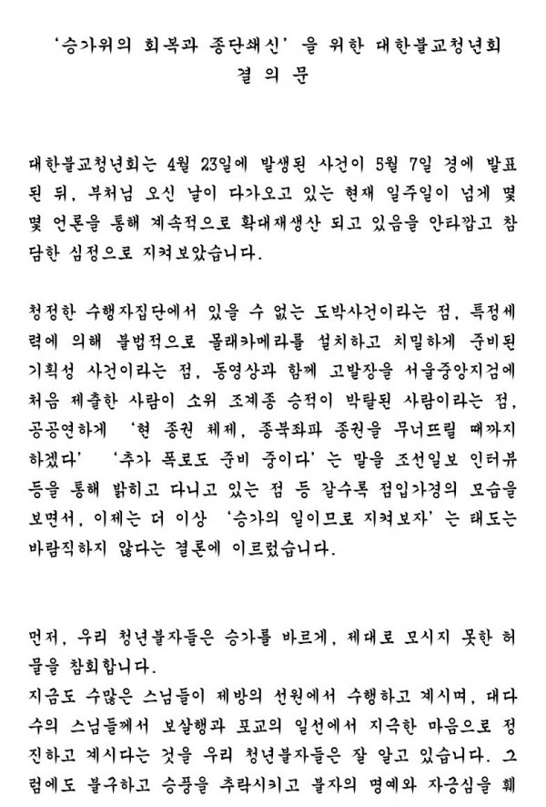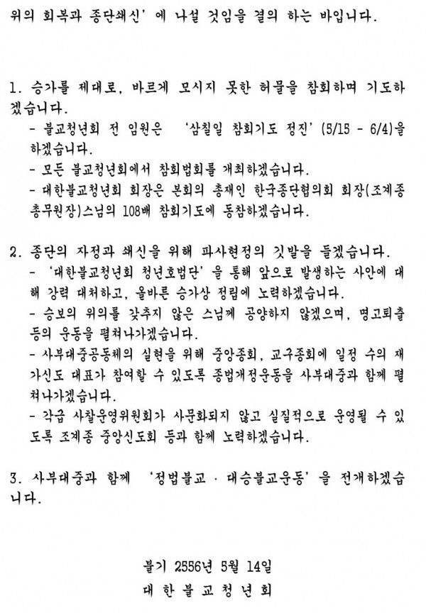 그동안 공공연하게 떠돌던 많은 불미스러운 일들에 대해 우리 청년불자들이 제목소리와 쇄신을 강하게 외치고 삼보의 한축인 승가가 아닌 땡중들이 제멋대로 휘두른 만행을 규탄하고 자정하라는 목소리를 오히려 대불청의 이름으로 더 강력하고 속시원하게 외침으로서 대다수의 국민들의 마음을 대변하는게 옳았다고 봅니다.