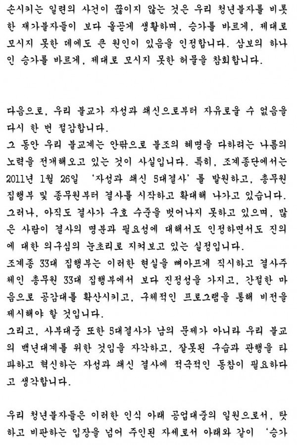 현실적인 대안도 없고 단지 참회만으로 끝날 문제는 아닌듯 한데 불자가 아닌 국민이 이번 결의문을