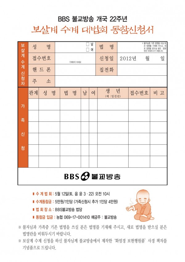 수계법회 참석을 원하시는 대한불교청년회 법우님들께서는 중앙사무국 (FAX.02-735-2707 , 메일주소 kyba@kyba.org)로 양식작성후 보내주시면됩니다. 중앙차원에서 일괄적으로 접수받아 신청을 도와드릴예정이니