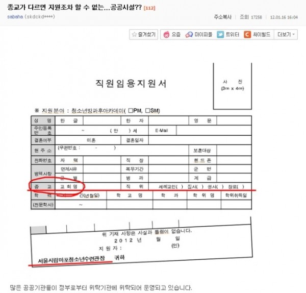 논란이 붉어지자 시립마포청소년수련관은 오늘(1월17일) 2012년도 직원임용지원서에 종교란을 삭제했다.