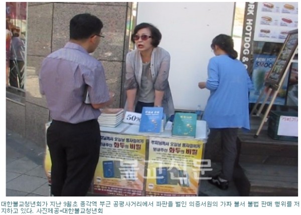 교회 출판사 의증서원서 수 달째 판매돼 본지 제보자들에 따르면 이들은 교회 한 켠에 출판사를 마련하고 기독교 서적과 함께 불교서적을 함께 만들어 판매하고 있다고 밝혔다. 사건의 발단은 지난 5월경으로 거슬러 올라간다. 문종남 조계종출판사 상무는 평소 알고 지내는 퀵서비스 종사자로부터 한 통의 전화를 받는다. 조계사 근처 우정국로에서 불서를 팔고 있어 <반야심경>을 구입했지만 내용이 불교와는 전혀 관계가 없다는 내용이었다. 평소 서점에 들를 시간이 부족했던 이 배달부는 마침 길에서 팔고 있어 샀지만, 집에서 찬찬히 읽어본 결과 불교를 비방하는 내용을 담고 있었다는 것이다. 문 상무는 “이 분이 불자여서 책을 사고 보시까지 했다”며 “너무 속이 상해 답십리에 있는 의중서원을 찾아갔더니 교회였다고 전해왔다”고 말했다. 제보자들에 따르면 이들은 이후 둘씩 짝을 지어 일주일에 1~2번씩 종각역과 종각역 2번 출구 방향 공평사거리, 우정국로를 왔다 갔다 하며 불자들과 일반 시민들을 상대로 책을 팔아왔다고 밝혔다. 문 상무는 이 상황을 두고만 볼 수 없어 본지에 제보하고 대한불교청년회에 도움을 요청했다. 본지가 구입한 책은 <금강경>. 몇 장을 넘겨보기도 전에 불교를 가장해 본뜻을 호도하고 있는 서적임을 알 수 있었다. 책에는 ‘부처님이 말씀하시는 생명은 성경 요한복음 1장1절에 말씀이 곧 하나님이라는 뜻과 같다’, ‘사리탑을 날마다 돌며 절을 해도 탑은 아무런 가르침을 주지 못한다’, ‘불자들이 반야를 신으로 인정하지 않는다면 반야심경을 아무리 독경해도 공염불에 지나지 않는다’ 등등 여러 군데에서 잘못된 해석을 발견할 수 있었다. 문종남 상무는 “책 판매자들은 교보문고 베스트셀러라며 거짓 광고도 하고 있다”며 “이 부근에서 책을 팔지 못하도록 조치를 취해야 한다”고 말했다. 대한불교청년회가 책 판매를 저지하기 위해 이들을 찾아간 것은 지난 9월초. 하지만 이들은 도리어 불교 책을 팔고 있다며 항의했다고 한다. 대불청이 ‘교회에서 불서를 발간하는 의도가 무엇이냐’ ‘정상적인 내용으로 보급해야 하는 것 아니냐’라고 밀어붙이자, 시민들의 눈을 의식한 판매자들은 황급하게 자리를 떴다.