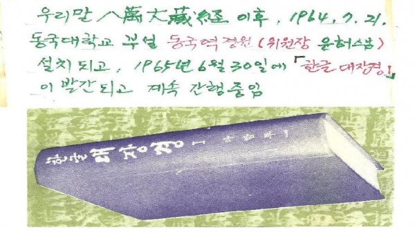 6. 우리말 팔만대장경 발간 1년이후 1964년 7월 21일 동국대학교 부설 동국역경원 설립후 37년간 한글대장경 318권 완역 (2001년) . 완역 한글대장경의 마중물....