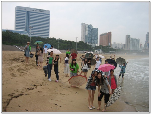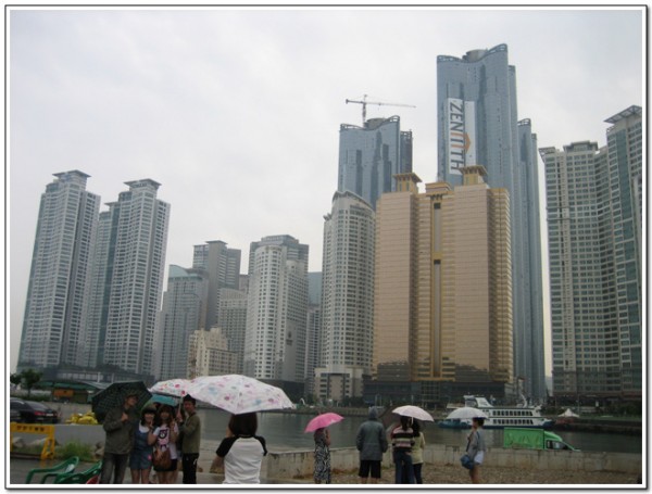 해운대 마천루 앞에서 기념촬영중...해운대로 이동중 장대비가 내렸으나...해운대에 도착하니 다행히 비가 그치기 시작...