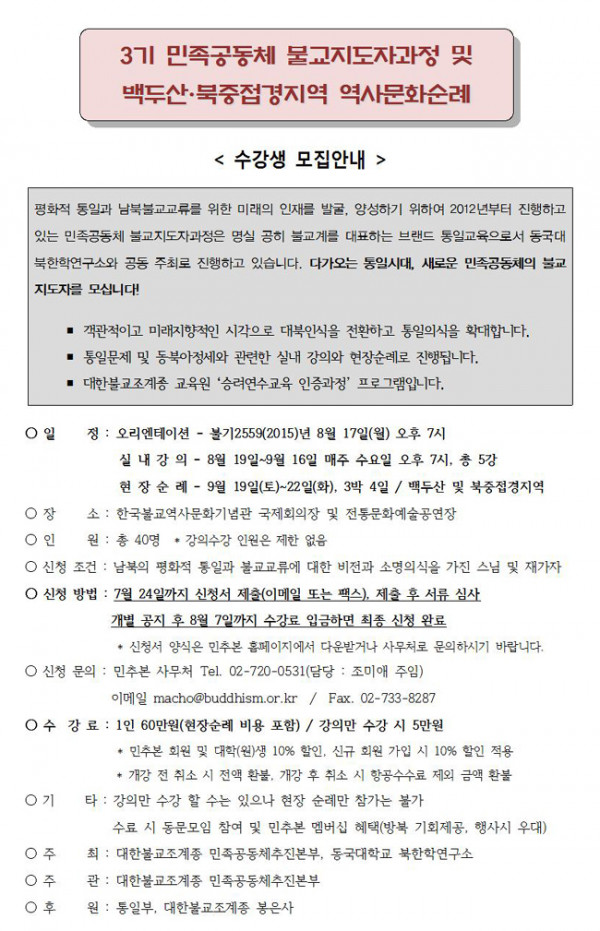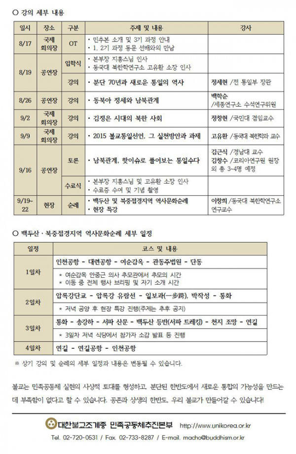 3기 민족공동체 불교지도자과정 및 백두산,북중접경지역 역사문화순례 수강생 모집안내