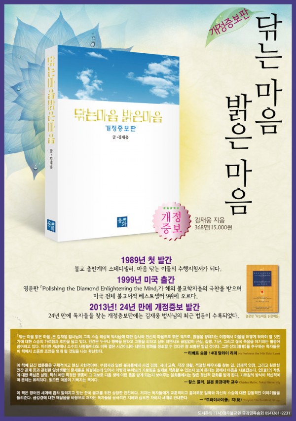 김재웅 지음|용화 펴냄|1만5천원 | 1989년 첫 발간 후 불교 출판계의 스테디셀러로 마음닦는 이들에게 수행지침서가 된 이 책이 24년만에 개정증보판을 발간했다. 이 책에는 저자의 최근 법문들이 수록돼 있으며, 법문중 나오는 불교용어도 쉽게 책 말미에 풀이해 놓았다.