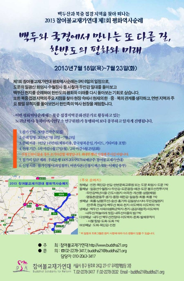 2013년 참여불교재가연대 백두산과 북중 접경 지역 평화역사순례에 많은 관심과 참여를 부탁드립니다.