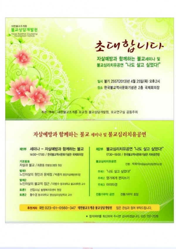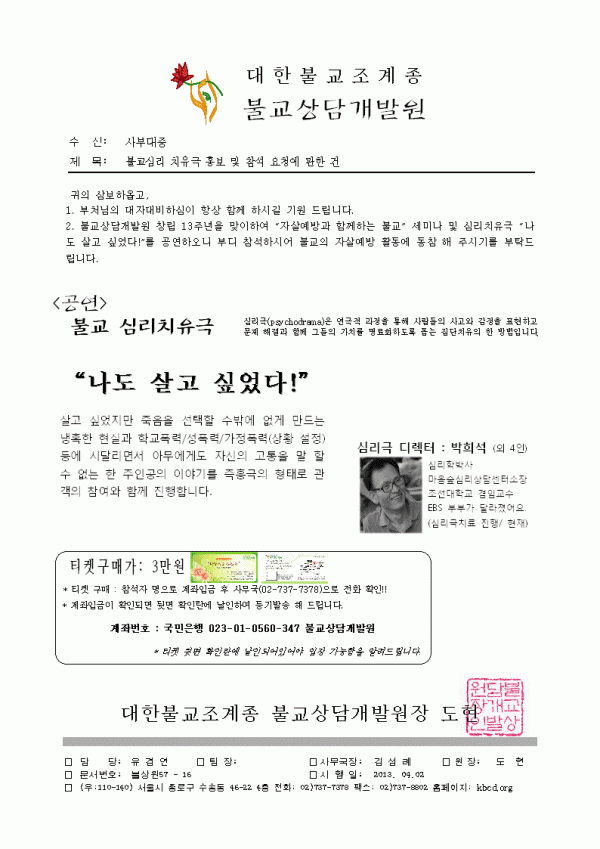 불교상담개발원 자살예방 세미나 및 불교심리치유극 개최안내