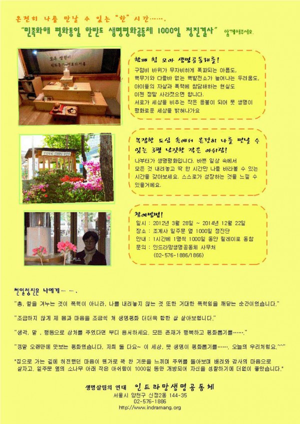 "한반도 생명평화공동체 천일정진" 을 통해 내 자신을 온전히 만날 수 있는 시간을 갖아보세요^^