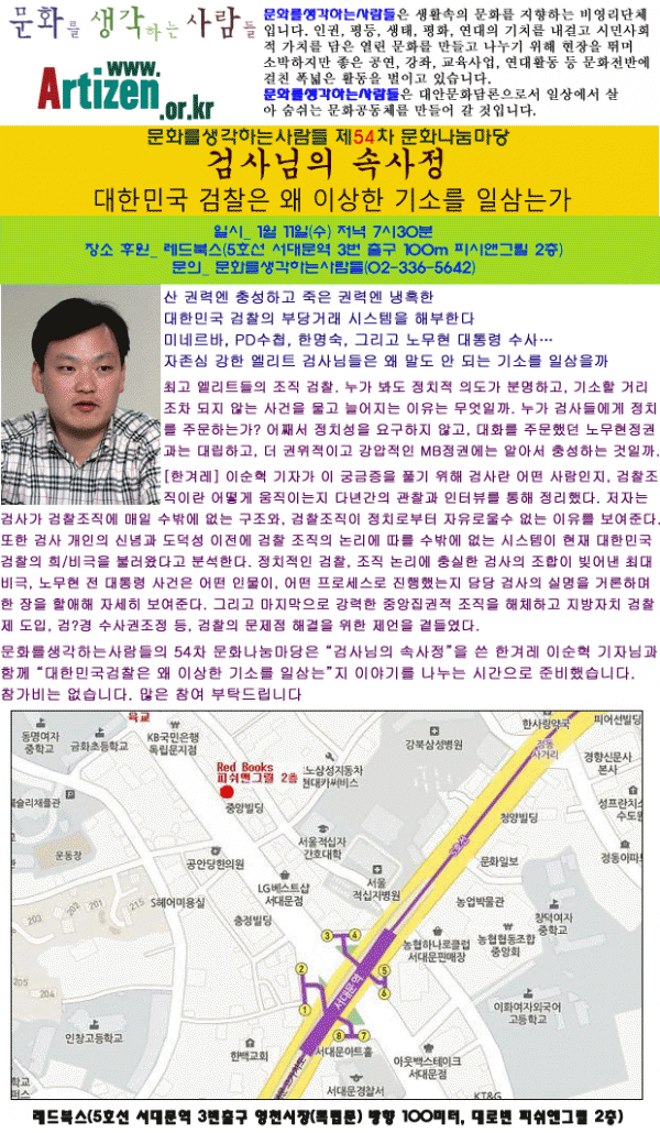 문화를생각하는사람들의 54차 문화나눔마당은 “검사님의 속사정”을 쓴 한겨레 이순혁 기자님과 함께 이야기를 나누는 시간으로 준비했습니다. 참가비는 없습니다.
