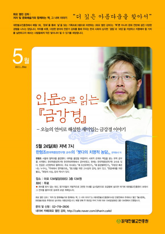 화요 열린 강좌 ‘저자와 함께하는 책, 그 너머 이야기’는 (재)대한불교진흥원(이사장 민병천) 에서 주최하고 월간『불교문화』와 BBS불교방송이 후원하여 실시하는 대중강좌입니다. 매월 넷째 주 화요일 저녁 7시에 마포 다보빌딩(BBS) 3층 다보원에서 진행됩니다.