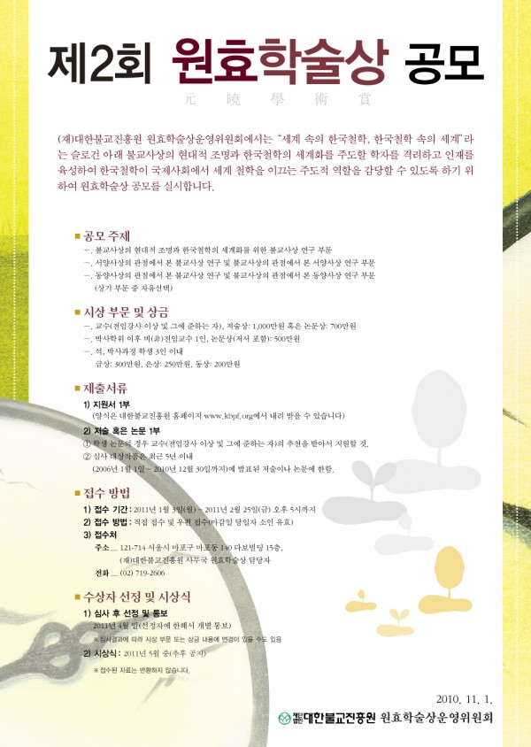 (재)대한불교진흥원 원효학술상운영위원회에서는세계 속의 한국철학, 한국철학 속의 세계라는 슬로건 아래 불교사상의 현대적 조명과 한국철학의 세계화를 주도할 학자를 격려하고 인재를 육성하여 한국철학이 국제사회에서 세계 철학을 이끄는 주도적 역할을 감당할 수 있도록 하기 위하여 원효학술상 공모를 실시합니다.