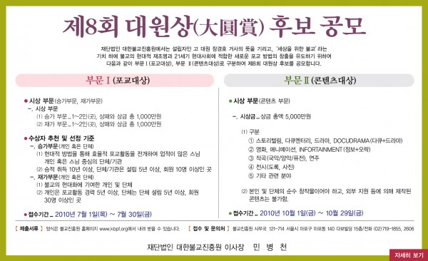 재단법인 대한불교진흥원에서는 설립자인 고 대원 장경호 거사의 뜻을 기리고, ‘세상을 위한 불교’라는 기치 하에 불교의 현대적 재조명과 21세기 현대사회에 적합한 새로운 포교방법의 창출을 유도하기 위하여 다음과 같이 부문Ⅰ(포교대상), 부문 Ⅱ(콘텐츠대상)로 구분하여 제8회 대원상 후보를 공모합니다.