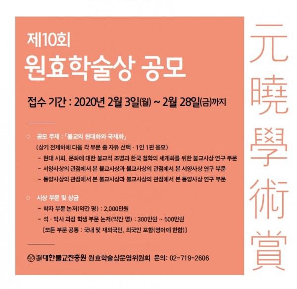 (재)대한불교진흥원 원효학술상운영위원회에서는 인문학과 사회과학 등의 분야에서 현대 사회, 문화에 대한 불교적 조명과 한국 철학의 세계화를 위해 노력하는 불교사상 연구 학자를 격려하고, 인류 문명의 창조에 주도적 역할을 담당할 수 있도록 하기 위하여 제10회 원효학술상을 공모합니다.