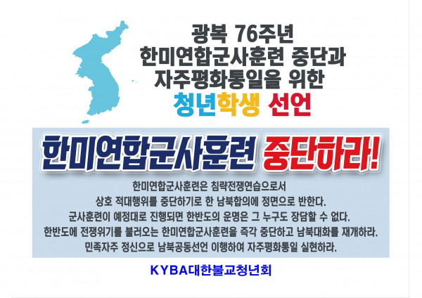대불청이 상임부대표로 활동하고 있는 6.15청학본부는 광복 76돌을 맞아 8.15추진위와 함께 한반도 평화를 해치는 한미연합군사훈련의 중단을 요구하는 "1만 단체 선언 / 10만 인증샷" 사업을 진행하고 있습니다.